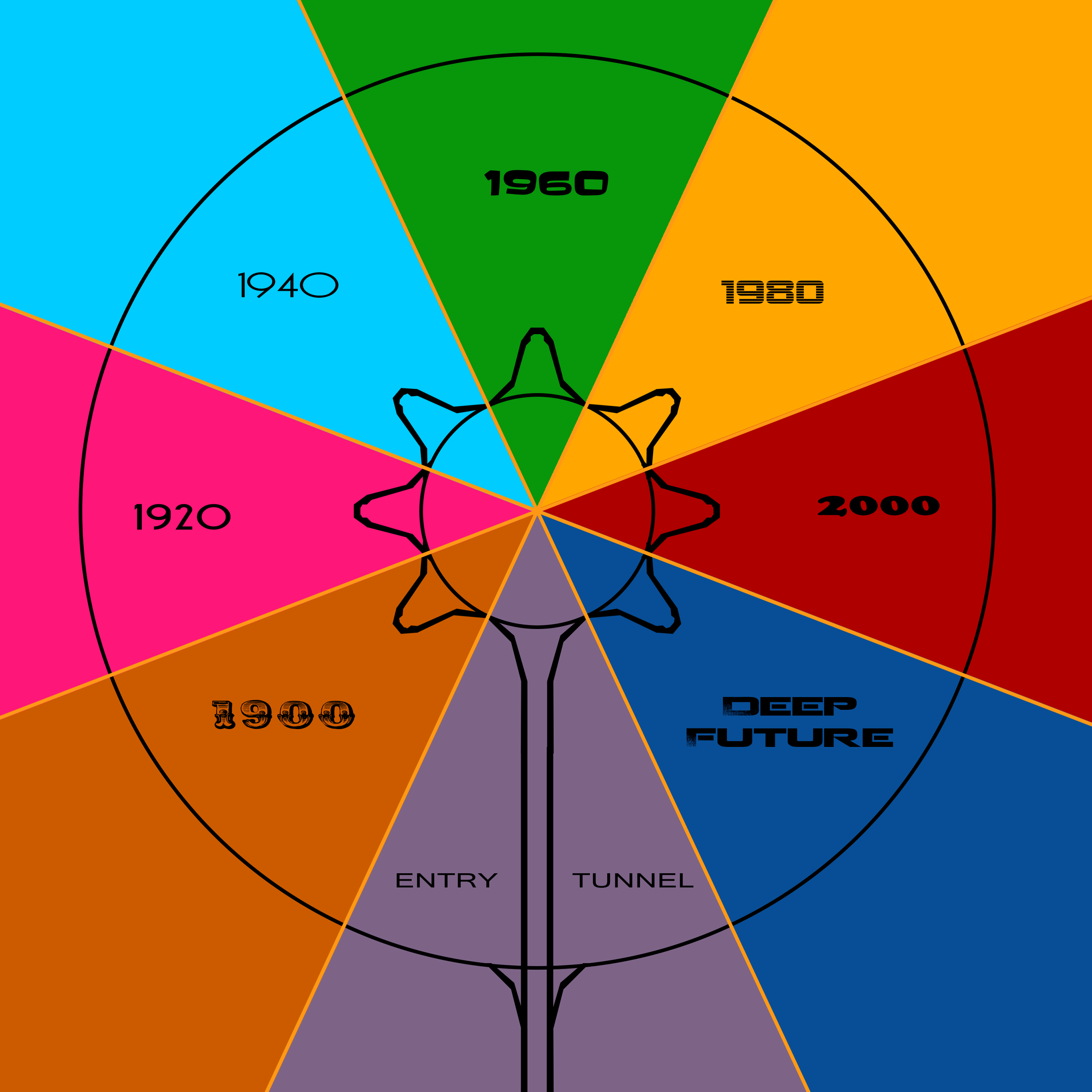 Ticketing is outside the park area, then you board a peoplemover that carries you through an entry strip in a tunnel (so that park is a perfect circle) and you emerge from the darkness into 1900, and can get off or keep riding, which then circles through 1920, 1940, 1960, 1980, 2000, and finally into the deep future before cycling again or returning to the ticketing area.