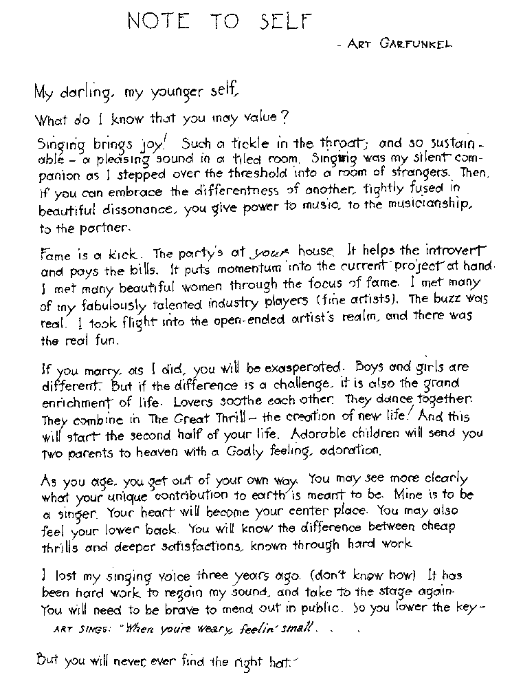 Time enough to think, about everything. “I think about what needs to be done. Sometimes it takes the form of those clear fields—singing and acting. Sometimes it takes in a wider range of choices. I'm forced to be a constant philosopher in order to keep defining the meaning of my life” — an endeavor nearly fifty years in the making. “There is a flip side,” wrote Tom Dunkel, “to eleven gold albums' worth of success: the benign curse of too much choice. Garfunkel doesn't have to do anything, so he agonizes over everything.”